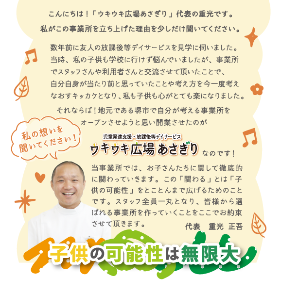 児童発達支援・放課後等デイサービスウキウキ広場あさぎりはスムーズな社会生活を送るための療育を行っていきます。日々の子育てでお疲れの親御さん、毎日仕事で忙しい親御さんが安心してお子さんを預け、悩みや相談事を気軽に話すことのできる憩いの場でもありたいと思っています。